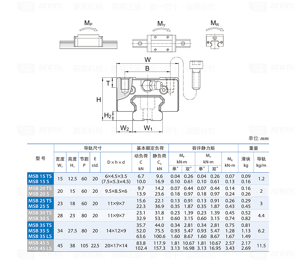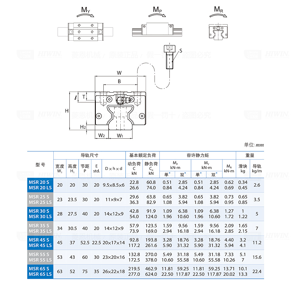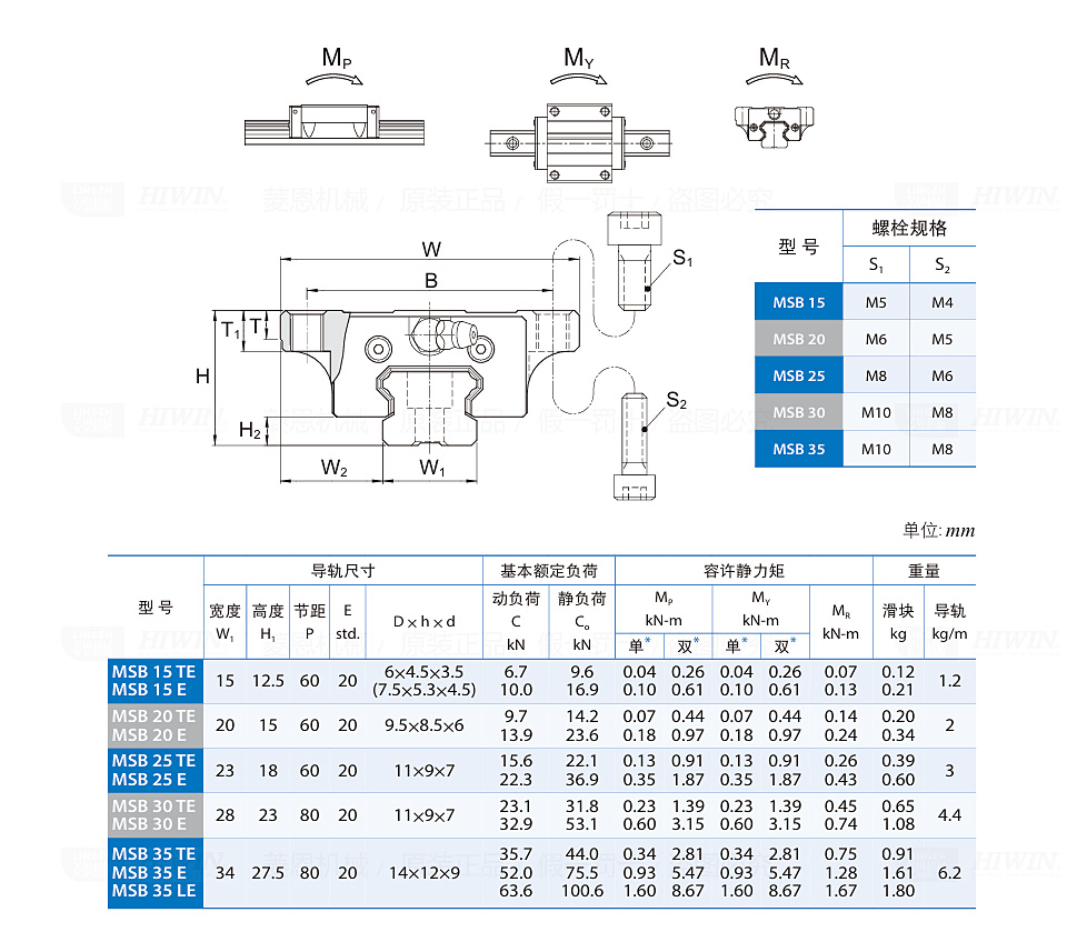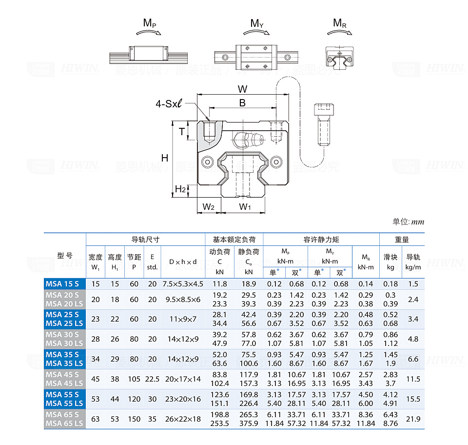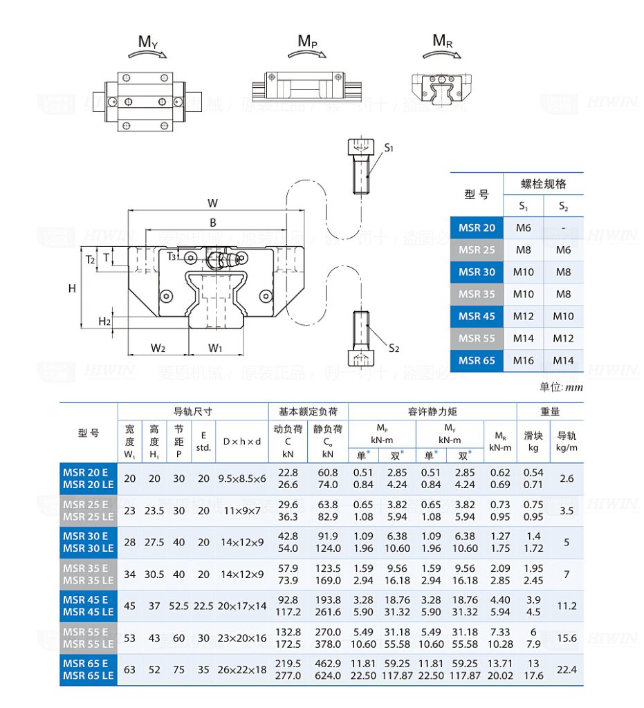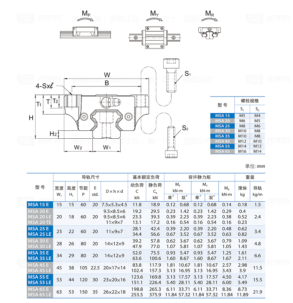 PMI/银泰滚珠直线导轨 摩擦阻力小的特性,对设备的驱动马力需求低,节省能源效果大,尤其运动磨耗小,温升效应低,可同时实现机械小型化与高速化的需求。 定位精度高可以实现μm级的定位精度。 低摩擦阻力滚动摩擦阻力可减小至滑动导轨摩擦阻力的1/20~1/40 。 高负荷可同时承受径向、反径向与横方向的负荷。 应用范围 适用于一般工具机、产业机械、电子产业等各项设备。 简介MSAMSBMSR 线性滑轨的安装只要在铣削或研磨加工的安装面上,以一定的组装步骤,即能重现线性滑轨的加工精密度,可降低传统铲花加工的时间与成本。并且其可互换之特性,可以将滑块任意配装在同型号的滑轨上,同时又保持相同的顺畅度与精密度,机台组装最容易,维修保养最简便。 尺寸参数 尺寸参数 尺寸参数