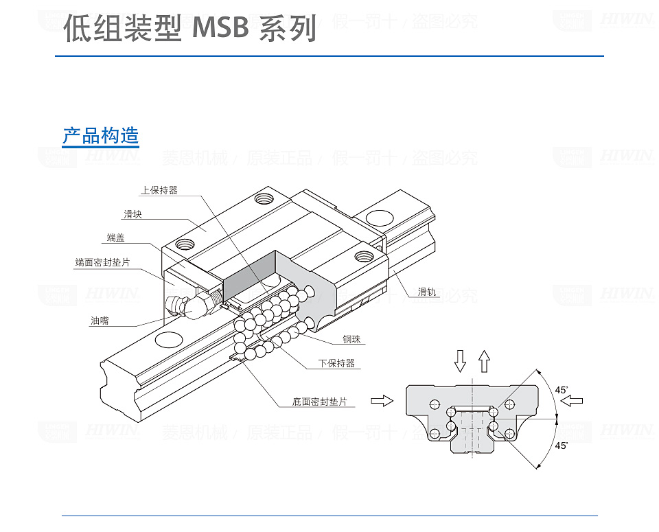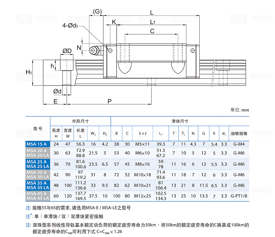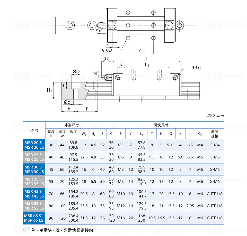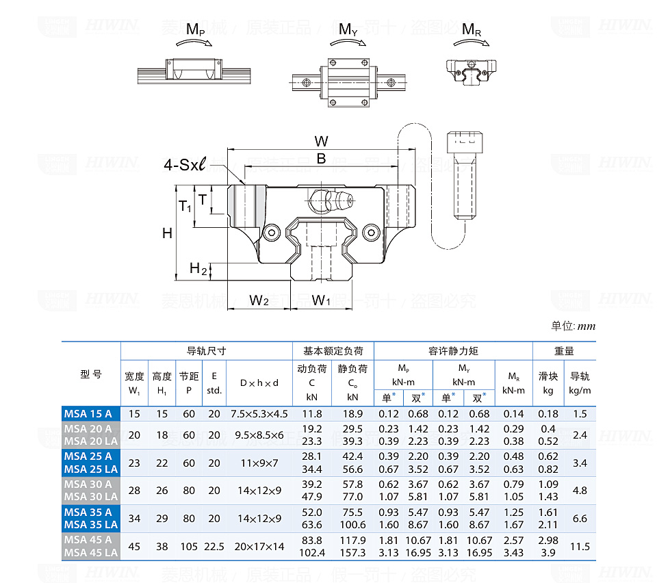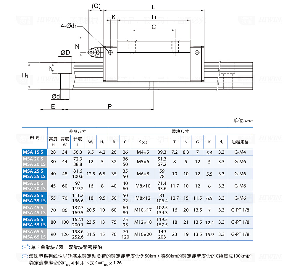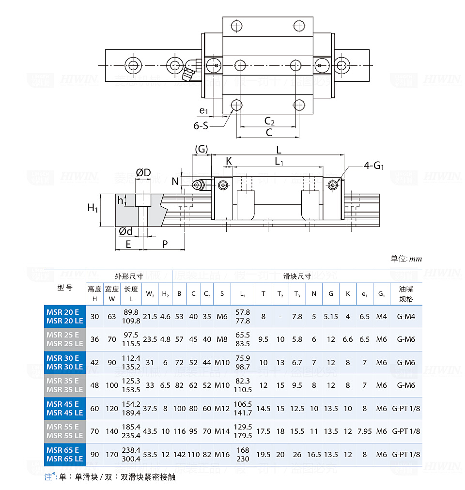 PMI/银泰滚珠直线导轨 摩擦阻力小的特性,对设备的驱动马力需求低,节省能源效果大,尤其运动磨耗小,温升效应低,可同时实现机械小型化与高速化的需求。 定位精度高可以实现μm级的定位精度。 低摩擦阻力滚动摩擦阻力可减小至滑动导轨摩擦阻力的1/20~1/40 。 高负荷可同时承受径向、反径向与横方向的负荷。 应用范围 适用于一般工具机、产业机械、电子产业等各项设备。 简介MSAMSBMSR 线性滑轨的安装只要在铣削或研磨加工的安装面上,以一定的组装步骤,即能重现线性滑轨的加工精密度,可降低传统铲花加工的时间与成本。并且其可互换之特性,可以将滑块任意配装在同型号的滑轨上,同时又保持相同的顺畅度与精密度,机台组装最容易,维修保养最简便。 尺寸参数 尺寸参数 尺寸参数